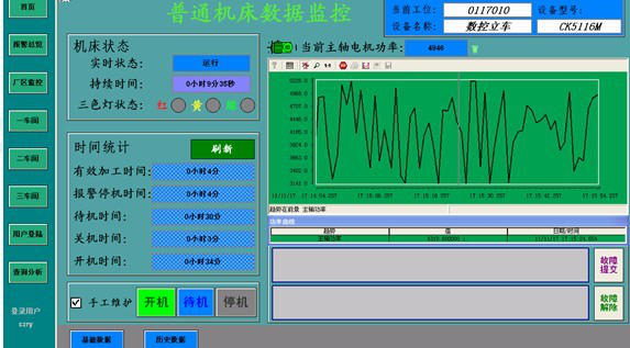在后臺(tái)計(jì)算機(jī)上,管理人員可查看各臺(tái)機(jī)床設(shè)備工作時(shí)間段的曲線和實(shí)時(shí)工況棒圖。曲線保存時(shí)間根據(jù)用戶(hù)要求可以設(shè)定,一般保存兩年,采取自動(dòng)覆蓋方式。